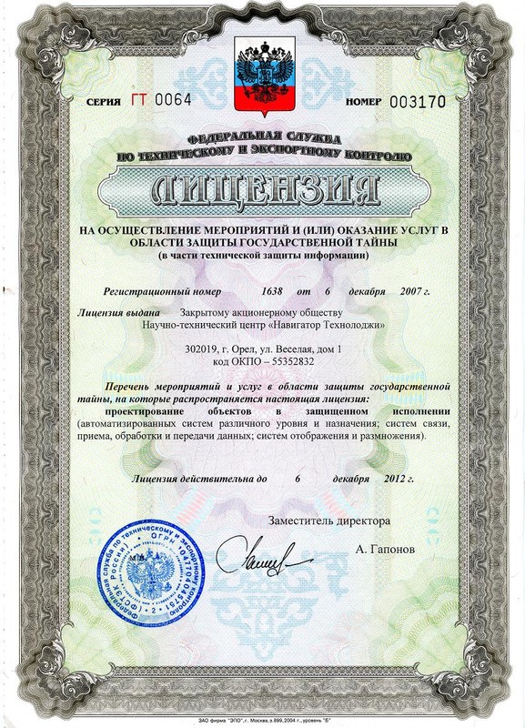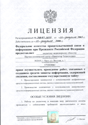 Лицензия ФСБ на осуществление мероприятий и оказание услуг в области зашиты государственной тайны |
